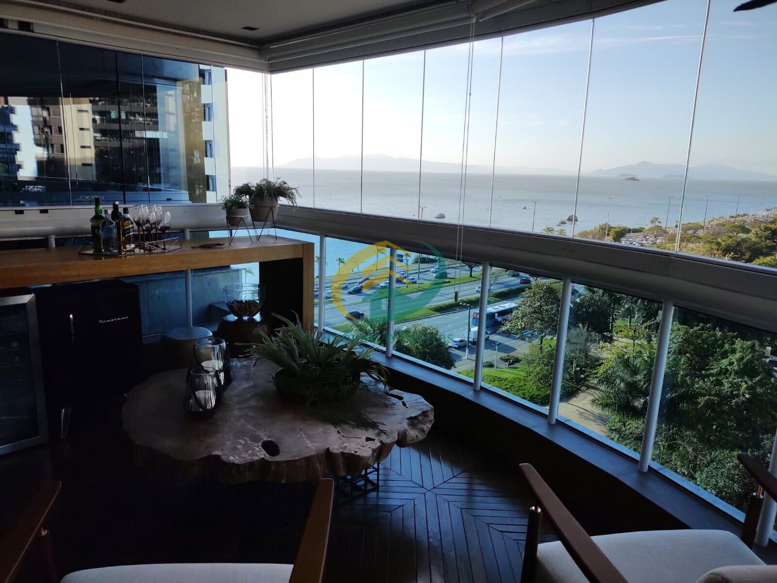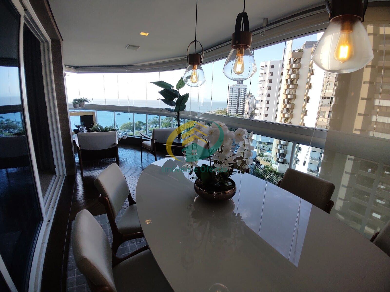 A sala com 3 amplos ambientes e possui ainda sacada com churrasqueira privilegiada por uma linda vista panorâmica para o mar da Baía Norte e teto rebaixado com iluminação indireta, ambos muito bem decorados.